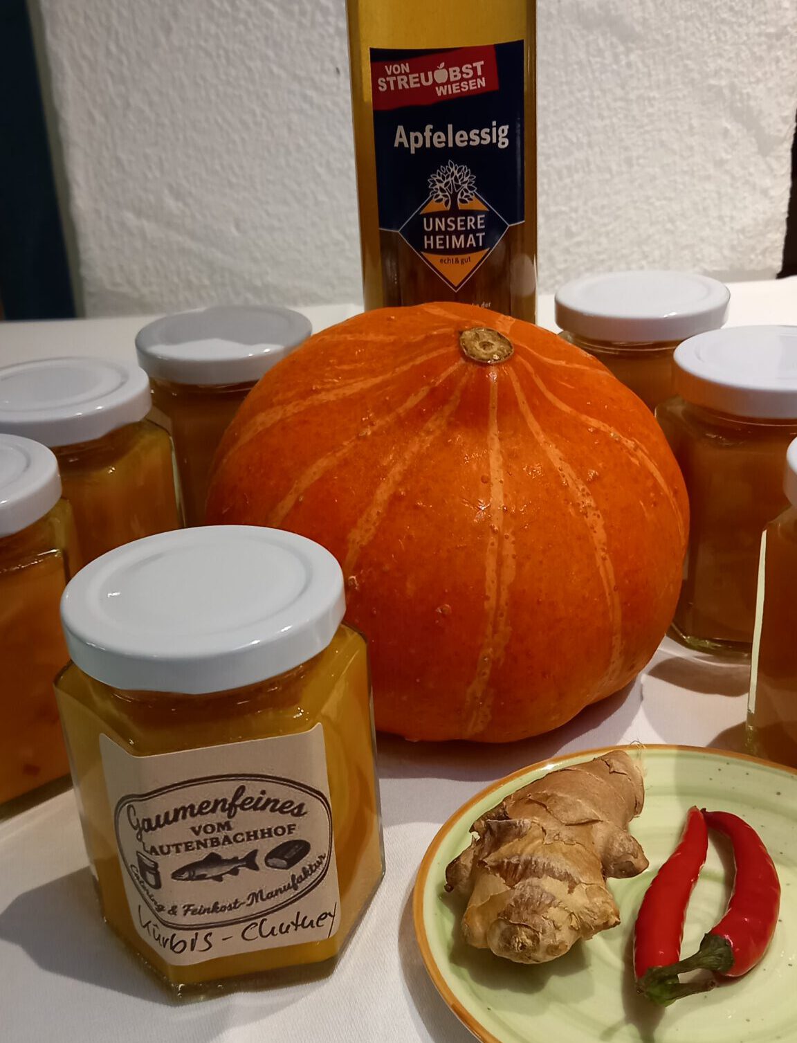 Zutaten: Hokkaido, Butternutkürbis, Gelierzucker, Weißwein, Apfelessig, Zitrone, Orange, Ingwer, Chili, Salz