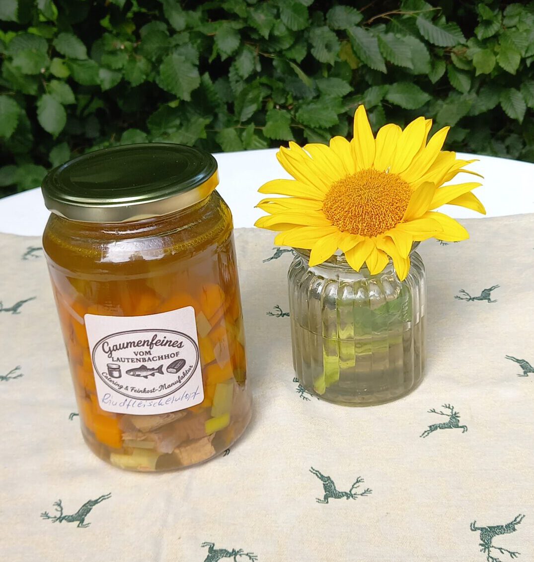 frisch gekochte Brühe aus Hohenloher Suppenfleisch mit Würfeln von Wurzelgemüse und gekochtem Rindfleisch.