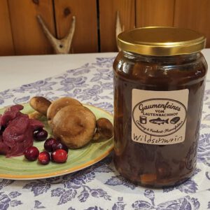handgeschnitten aus der Wildschweinkeule, verfeinert mit der herben Note der Cranberries